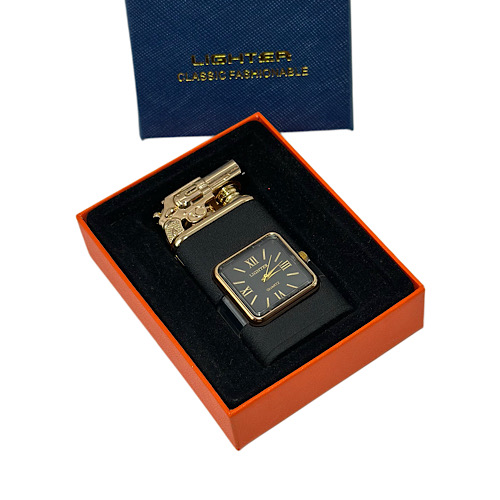 Briquet à gaz noir mat, avec flamme classique, présenté dans sa boîte élégante. Orné de détails dorés et intégrant une montre raffinée, il allie luxe et fonctionnalité. Idéal comme cadeau chic pour homme, ce briquet séduit par son design premium et son style sophistiqué.