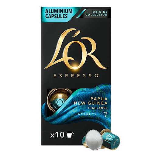 Découvrez l’élégance du café L’OR Espresso Papua New Guinea, un 100 % Arabica aux notes fruitées et boisées, légèrement sucrées. D’intensité 7, il offre un espresso doux, raffiné et équilibré. Présenté en boîte de 10 capsules en aluminium recyclable, compatible Nespresso Original et L’OR BARISTA.