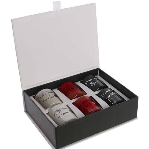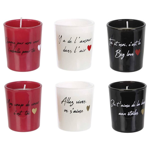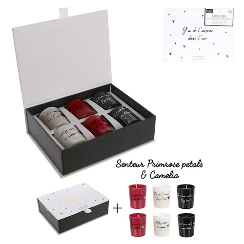 Le coffret de 6 bougies parfumées est un ensemble élégant et raffiné, parfait pour créer une ambiance chaleureuse et romantique dans votre intérieur. Chaque bougie est présentée dans un pot en verre décoratif, avec inscriptions de mots d’amour, pour ajouter une touche poétique et chic.
