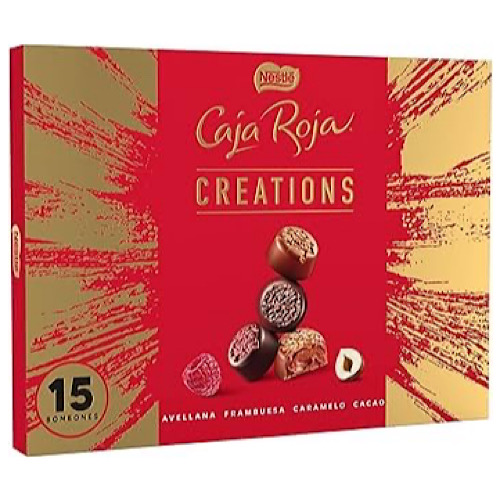 Coffret de chocolats Caja Roja Creations – Nestlé (186 g) : un assortiment élégant de bombons premium de la marque Nestlé Caja Roja, réunis dans une boîte de 186 g. Chaque bonbon est une création unique mêlant différentes textures et saveurs — comme chocolat au lait ou chocolat noir avec praliné, framboise, caramelo salé ou morceaux croquants — pour une dégustation riche et gourmande, idéale à partager ou à offrir.