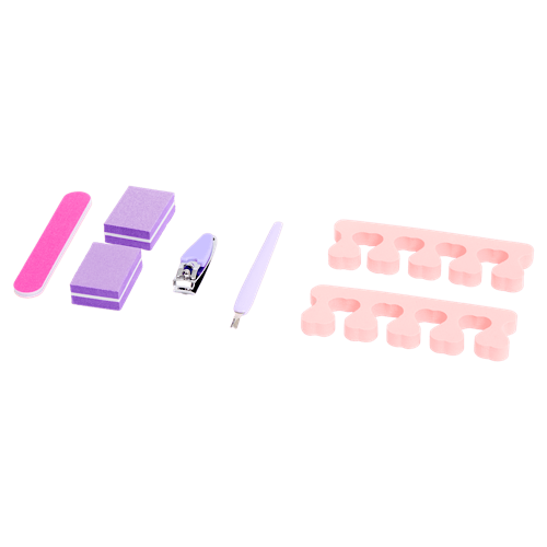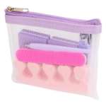 Un mini kit pédicure pratique et coloré, parfait pour prendre soin de ses ongles où que vous soyez. Il contient une lime, un séparateur d’orteils, un petit coupe-ongles et des accessoires essentiels, le tout rangé dans une pochette transparente à zip lilas. Compact, léger et idéal pour une retouche rapide ou une routine beauté.