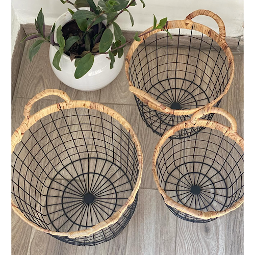 Paniers métal rotin, paniers déco maison, panier rangement design, trio de paniers rotin métal.