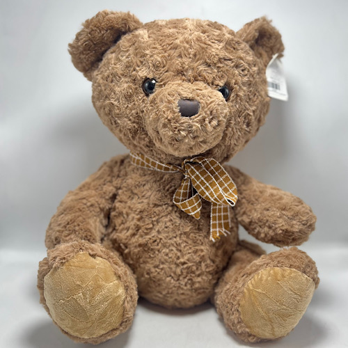 Ce joli ours en peluche, avec son pelage brun bouclé et sa petite écharpe à carreaux, dégage une douceur irrésistible. Ses grands yeux brillants et ses pattes moelleuses en font un compagnon parfait pour les câlins. Un cadeau chaleureux et plein de tendresse, idéal pour faire plaisir à tous les âges.