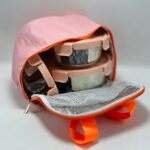 L’ensemble est complété par un sac de transport isotherme assorti, de couleur rose douce avec une anse orange vif, qui maintient vos repas à la bonne température jusqu’à l’heure du déjeuner.