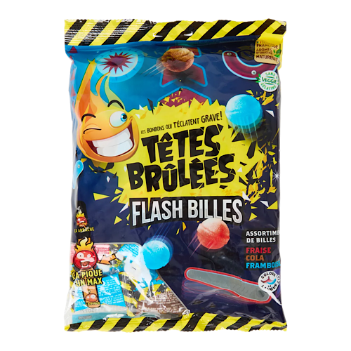 Sachet de bonbons Flash Billes – Têtes Brûlées 200 g : un assortiment de billes acidulées au cœur fondant, qui mêlent intensité piquante et saveurs fruitées explosives. Parfait pour les amateurs de sensations fortes et de bonbons au goût audacieux.