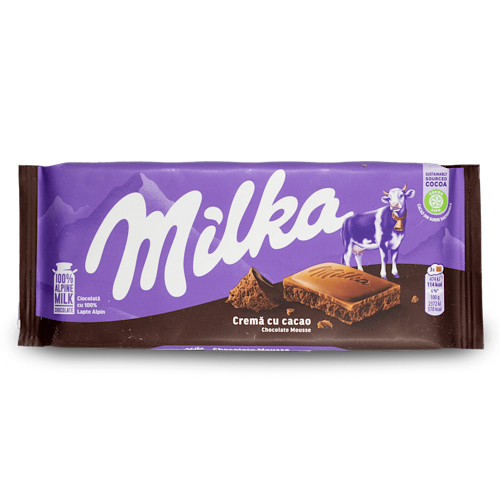 La tablette Milka au lait est une barre de chocolat au lait alpin onctueux de la marque Milka, souvent agrémentée de petits biscuits croquants LU intégrés dans le chocolat, ce qui crée un contraste fondant et croustillant très gourmand.
