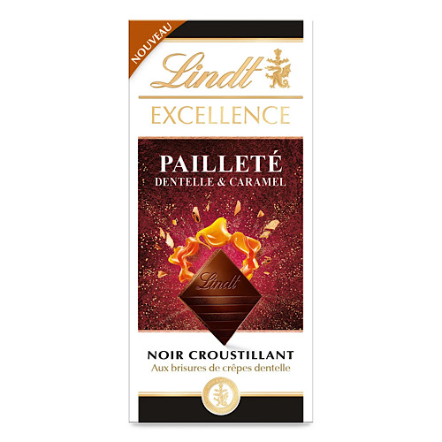 Tablette de chocolat noir EXCELLENCE Lindt 100 g, au croustillant pailleté dentelle et aux éclats de caramel. Une combinaison de chocolat noir extra-fin, de crêpe dentelle légère et de caramel croquant, offrant une texture gourmande et une saveur riche et équilibrée.